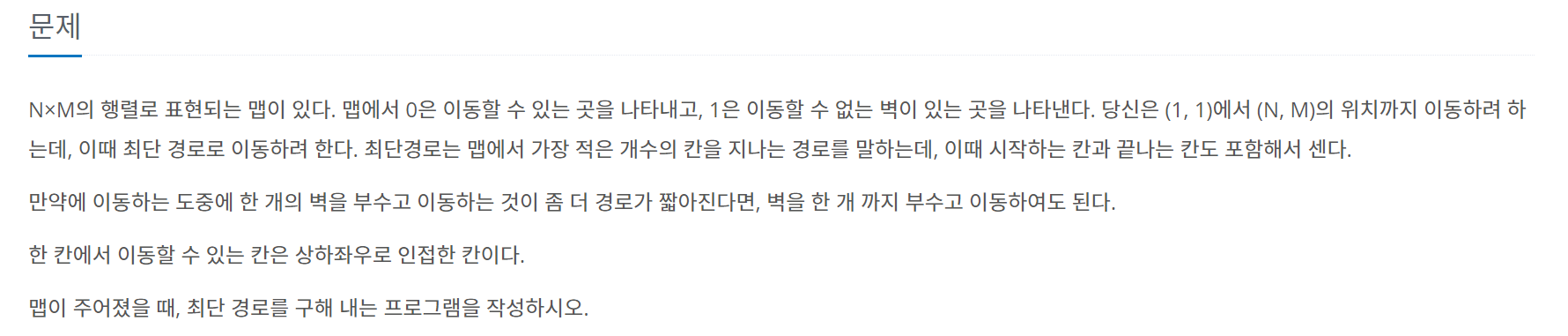 - 3차원 배열을 사용해 벽을 부순 경우와 벽을 부수지 않은 경우로 나누어 카운트를 할 수 있다.